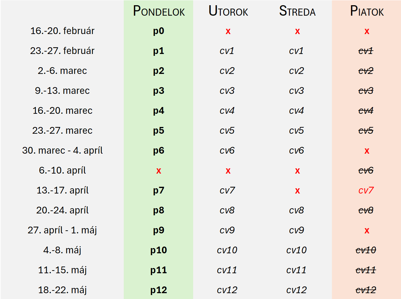 - v roku 2026 odpadá cvičenie 3. apríla, prednáška 6. apríla a cvičenie 7. apríla (Veľkonočné sviatky a s nimi súvisiace dekanské a rektorské voľná), cvičenie 15. apríla (celofakultné kolo ŠVK), cvičenie 1. mája (štátny sviatok)