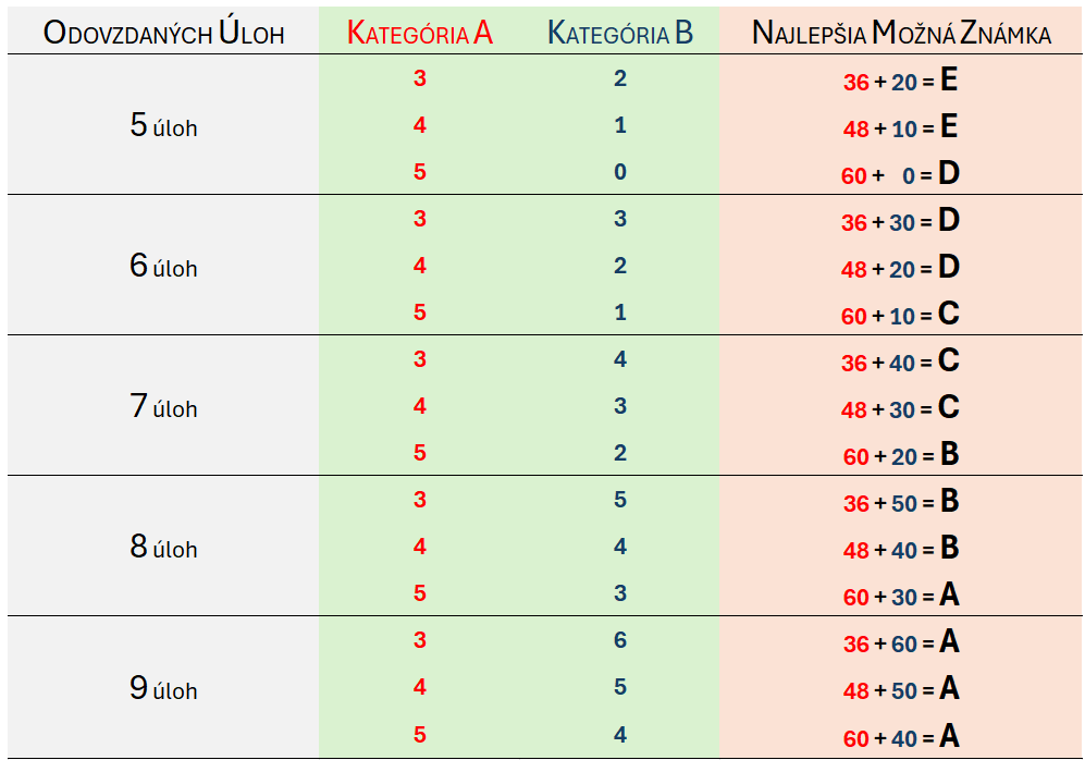 - úlohy sú rozdelené na 5 A-čkových a 8 B-čkových, výsledná známka sa vypočítava na základe tabuľky nižšie